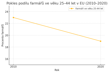 12 % zemědělských podniků v EU, přičemž pouze 3 % z nich jsou ženy. Podíl farmářů ve věkové skupině 25–44 let se snížil, a to z 23 % v roce 2010 na 19 % v roce 2020. Tento trend zdůrazňuje nutnost větší podpory a zapojení mladých farmářů do zemědělství.Cílem EU je podpořit vznik 377 000 mladých farmářů prostřednictvím financování z CAP, což jim pomůže vytvořit ekonomicky životaschopné podniky a přispět k udržitelnosti venkova.