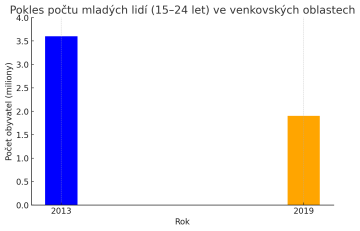 Klesající počet mladých lidí ve venkovských oblastech: Podíl mladých lidí ve venkovských regionech se snižuje. Data z Eurostatu ukazují, že mezi lety 2013 a 2019 počet mladých lidí ve věku 15–24 let ve venkovských oblastech výrazně klesl, a to z 3,6 milionu na 1,9 milionu.