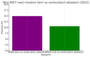 Genderové rozdíly: Ve venkovských oblastech je vyšší podíl NEETs (mladých lidí, kteří nejsou zapojeni do vzdělávání, zaměstnání ani odborné přípravy) ve srovnání s městskými oblastmi. V roce 2022 bylo 14,9 % mladých žen na venkově v kategorii NEETs, zatímco u mladých mužů to bylo 10,5 %. To poukazuje na genderovou nerovnost, kterou je třeba řešit, aby se zajistily rovné příležitosti pro mladé lidi v těchto regionech.