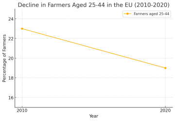 Despite the efforts, young farmers (under 40) manage only 12% of farm holdings in the EU, with only 3% being female farmers. The share of farmers in the 25-44 age group has declined, showing a decrease from 23% in 2010 to 19% in 2020. This trend underscores the need for more young farmers to be supported and involved in agriculture.