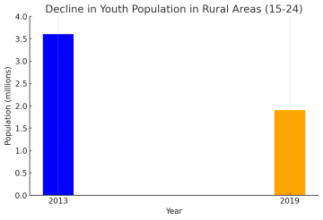 Declining Youth Population in Rural Areas: The proportion of young people in rural areas is decreasing. Data from Eurostat shows that between 2013 and 2019, the number of young people aged 15-24 in rural areas dropped significantly, from 3.6 million to 1.9 million.