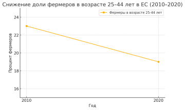 Несмотря на усилия, молодые фермеры (до 40 лет) управляют лишь 12% фермерских хозяйств в ЕС, причем только 3% из них — женщины. Доля фермеров в возрастной группе 25–44 лет снизилась: с 23% в 2010 году до 19% в 2020 году. Эта тенденция подчеркивает необходимость усиленной поддержки молодежи в сельском хозяйстве.
