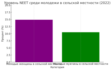 Гендерные различия: В сельской местности доля молодежи, не вовлеченной в образование, трудовую деятельность или профессиональное обучение (NEETs*), выше, чем в городах. В 2022 году 14,9% молодых женщин в сельских районах относились к категории NEET, в то время как среди молодых мужчин этот показатель составлял 10,5%. Это указывает на существующий гендерный разрыв, который необходимо учитывать для обеспечения равных возможностей для молодежи в этих регионах.